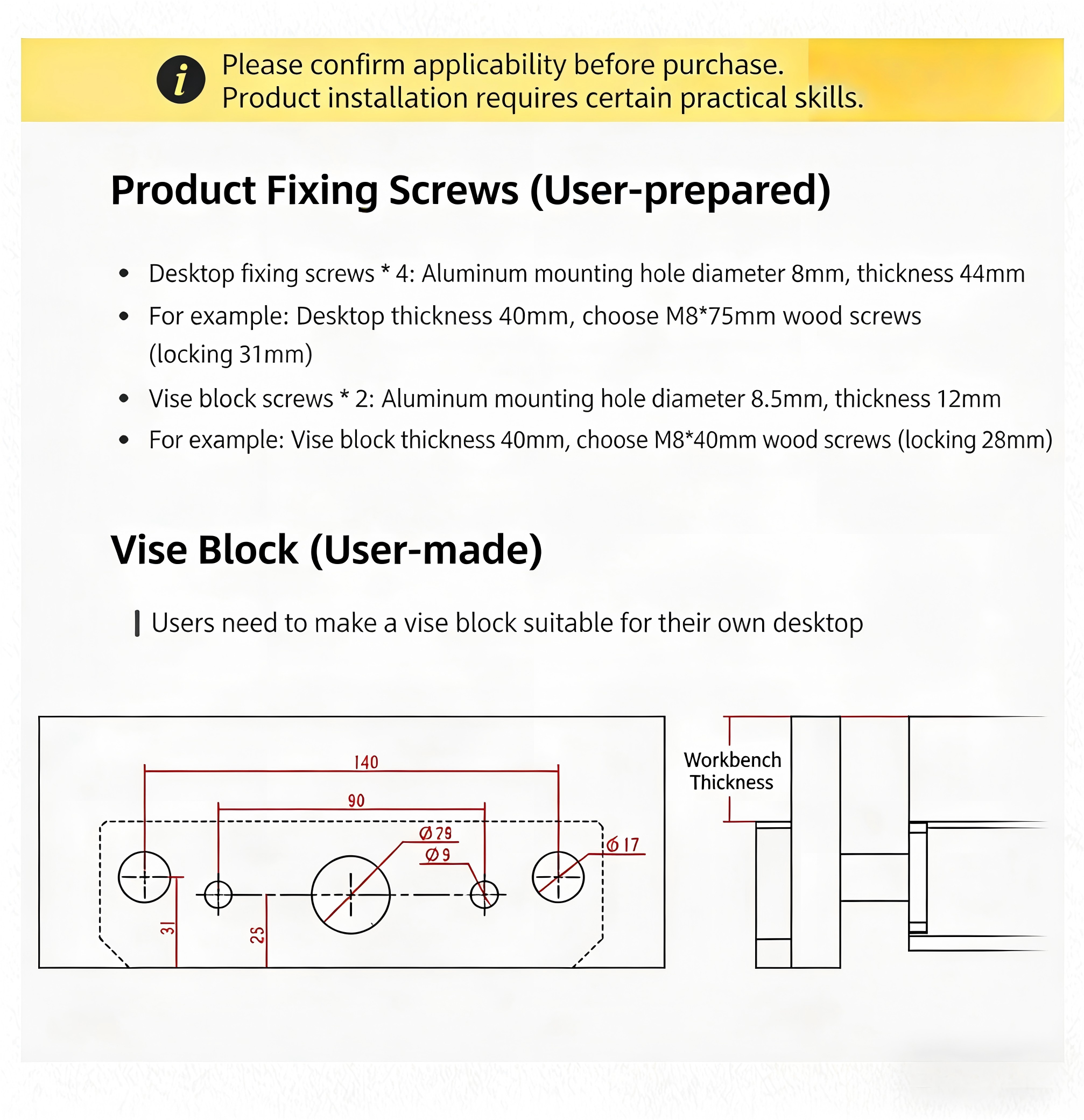 Designed to fit standard woodworking benches, the vise comes with pre-drilled mounting holes (8mm diameter) for hassle-free under-bench installation. It supports custom wooden jaw liners (user-made or M8 wood screws included) to protect delicate wood surfaces while enhancing grip. Whether you’re building furniture, crafting models, or tackling DIY projects, this vise adapts to all your needs.