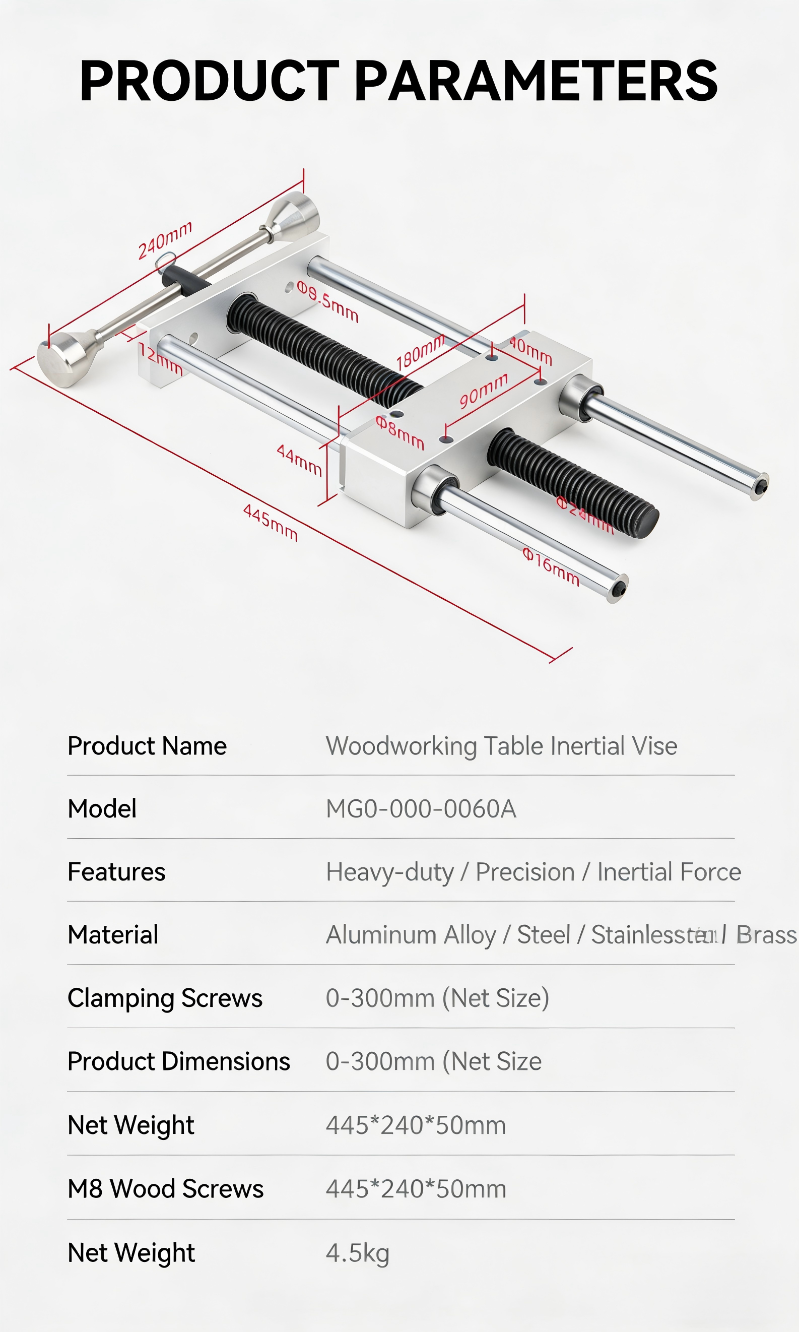 With a maximum clamping range of 0-300mm (net size), this heavy-duty vise handles large panels and small components alike. The polished guide rods reduce friction and wear, ensuring long-term reliability. Ideal for routing, planing, chiseling, and precision drilling—every cut is clean, accurate, and free from slippage.